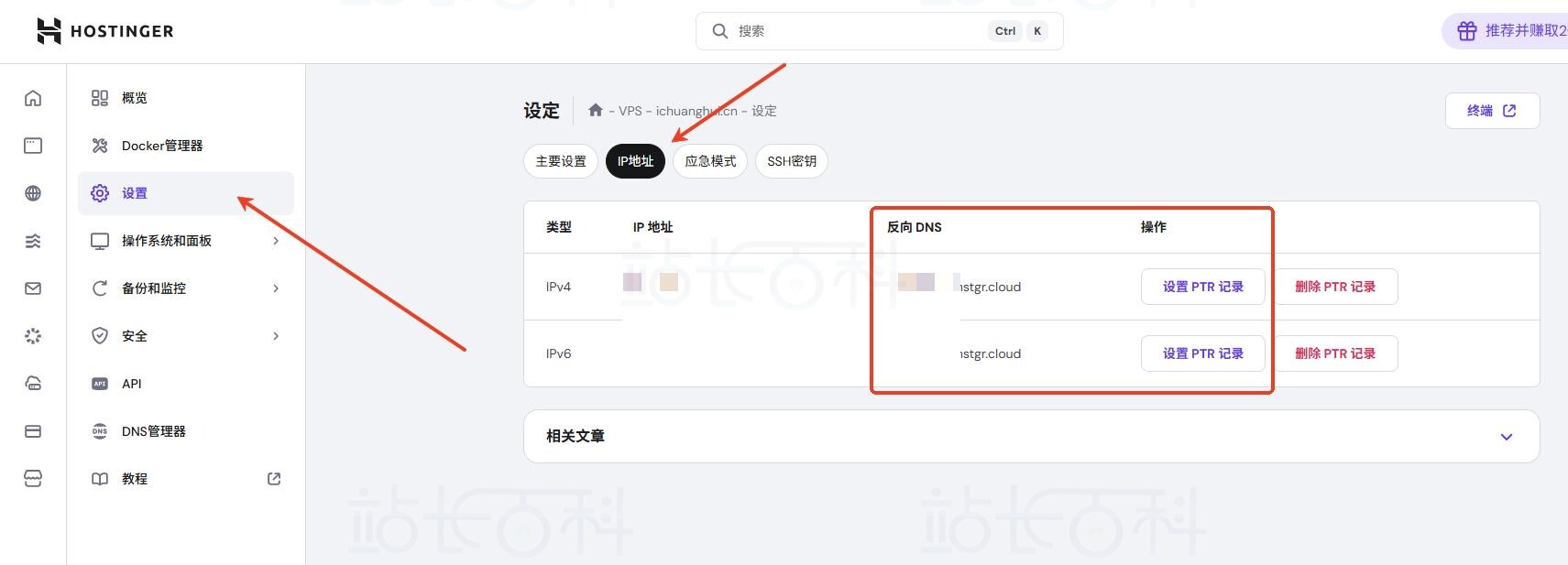 操作完成后进入Hostinger后台VPS管理>IP管理>设置 rDNS,将下图中改成你的域名(格式为mail.你的域名.com)。填写时确保“IP反查域名”与mail.你的域名.com一致。