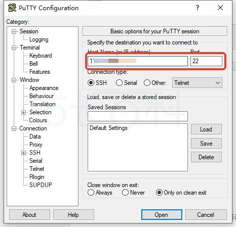打开PuTTY,在“HostName”栏粘贴VPS IP,“Port”栏填SSH端口(默认22);