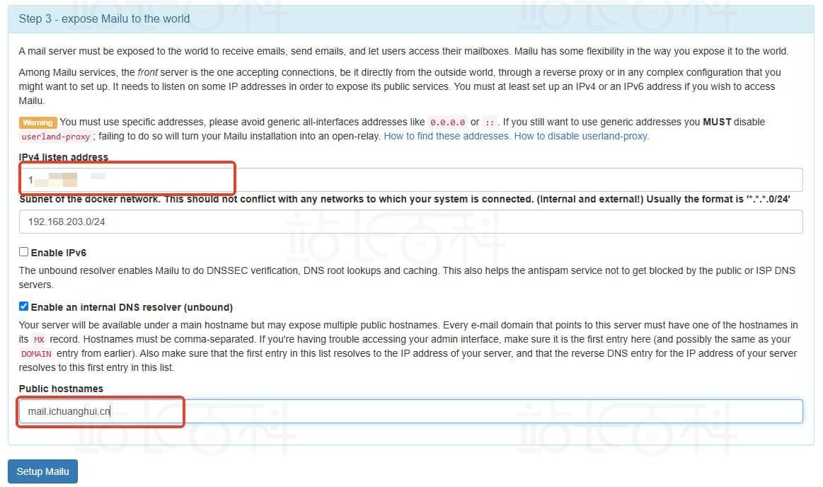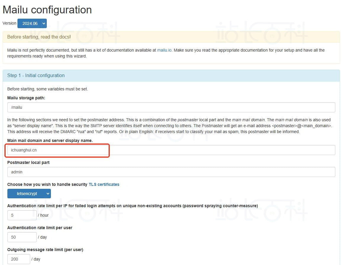 打开浏览器,访问Mailu官方配置:https://setup.mailu.io/2024.06/,按以下参数设置: