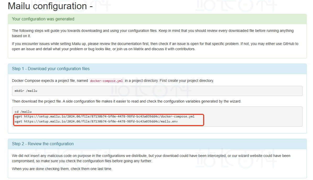 紧接着Mailu向导会生成几段命令,请依次复制到SSH终端中执行。