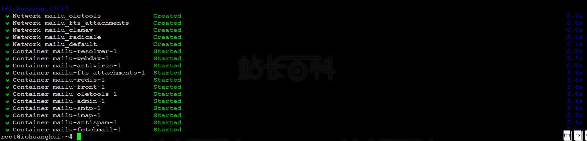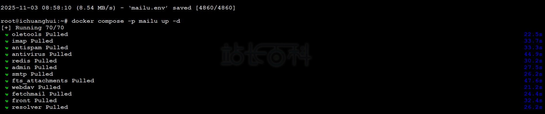随后运行步骤三中的第一行命令拉取Mailu镜像和启动(docker compose -p mailu up -d)。