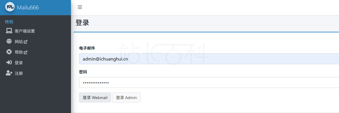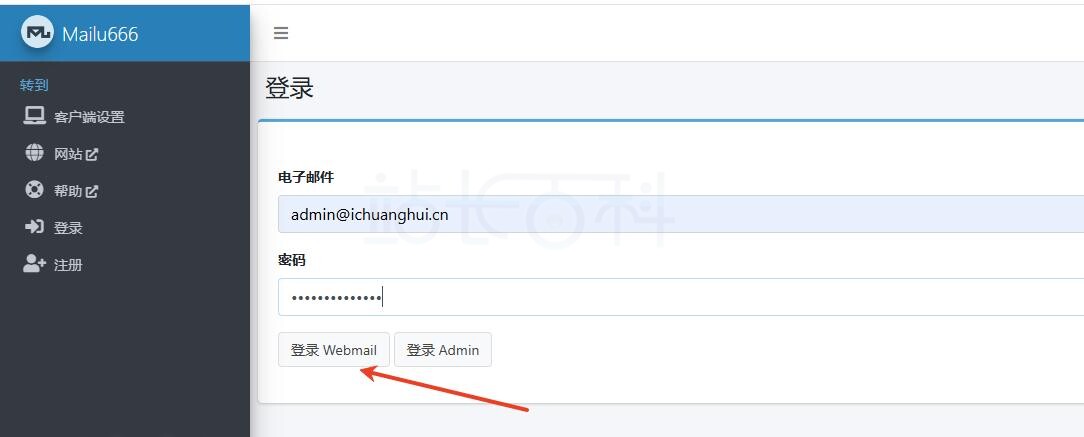 打开浏览器,访问https://mail.你的域名.com,用刚才创建的管理员邮箱(admin@你的域名.com)和密码登录(注意是登录Admin)。