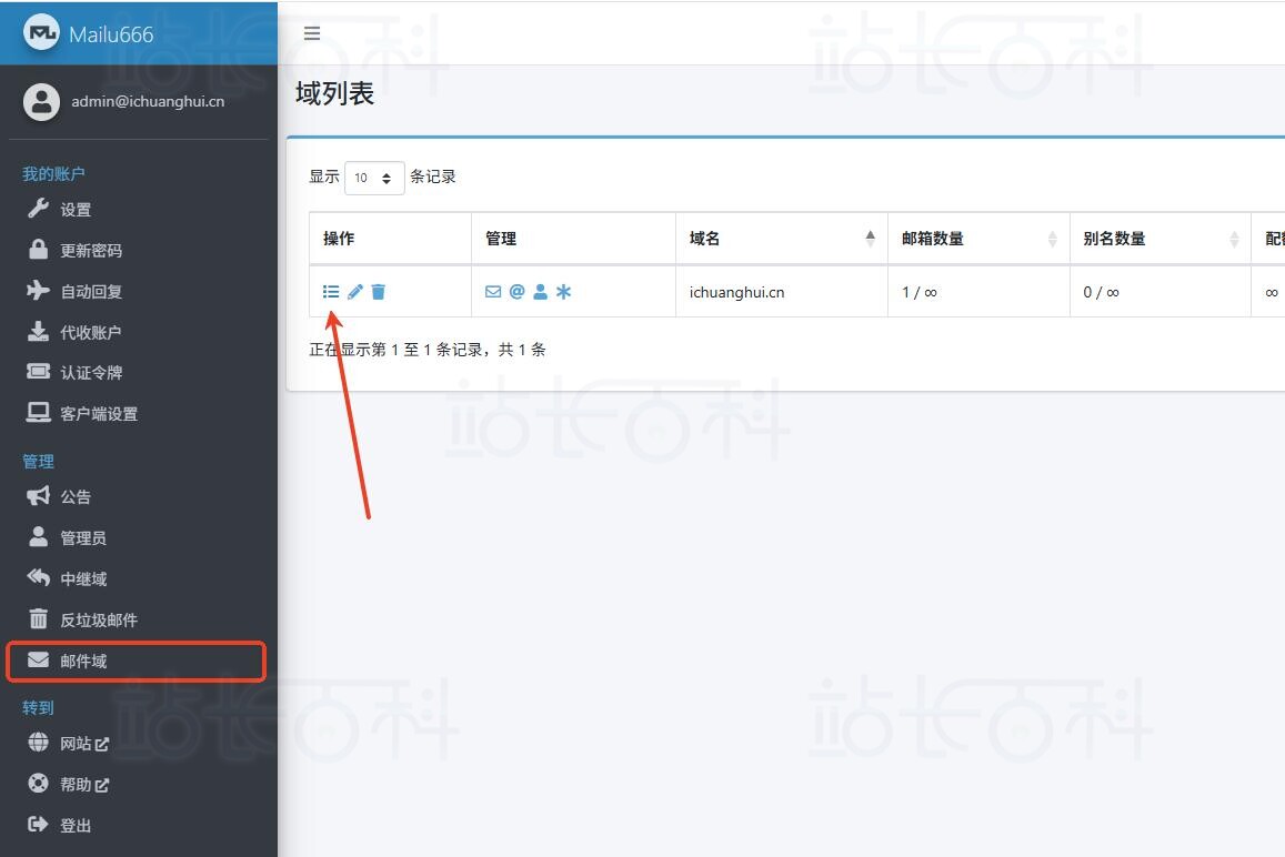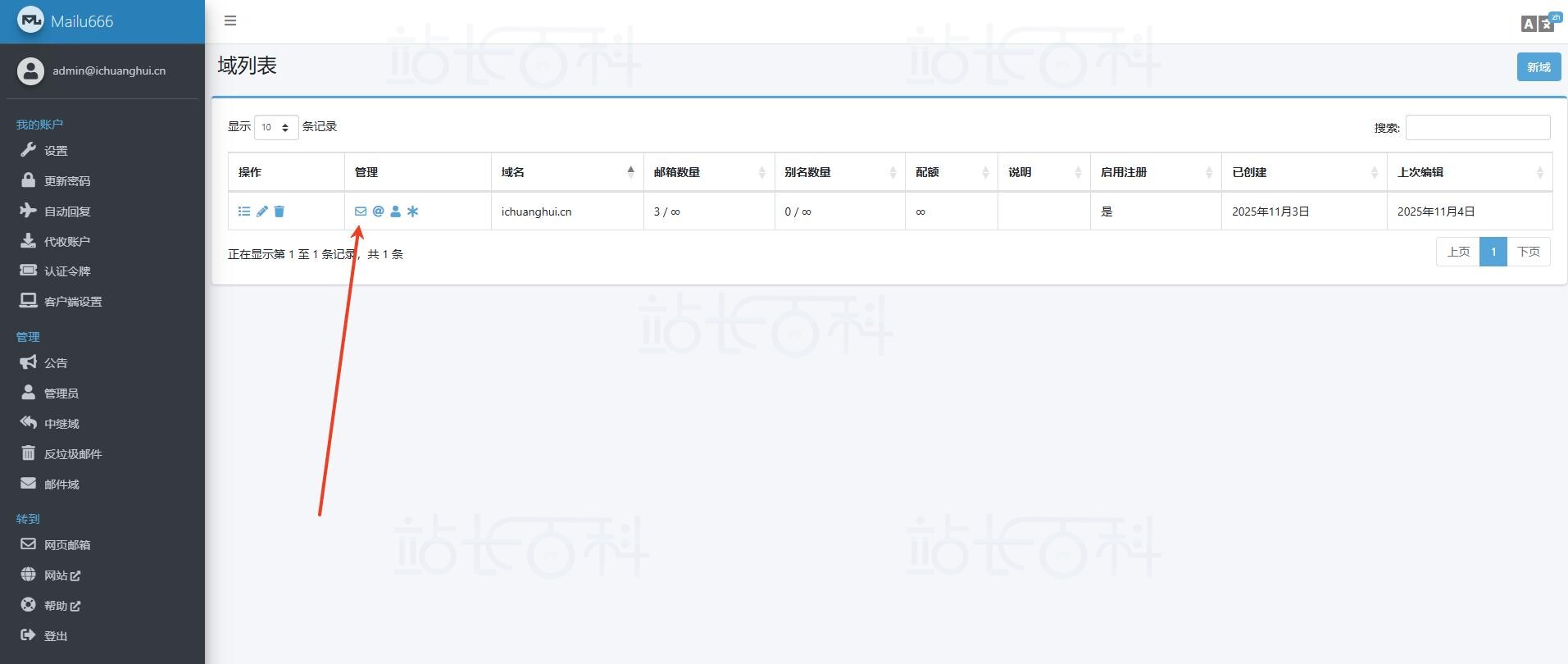 还是在Mailu后台邮件域页面,点击如下图所示信封图标。