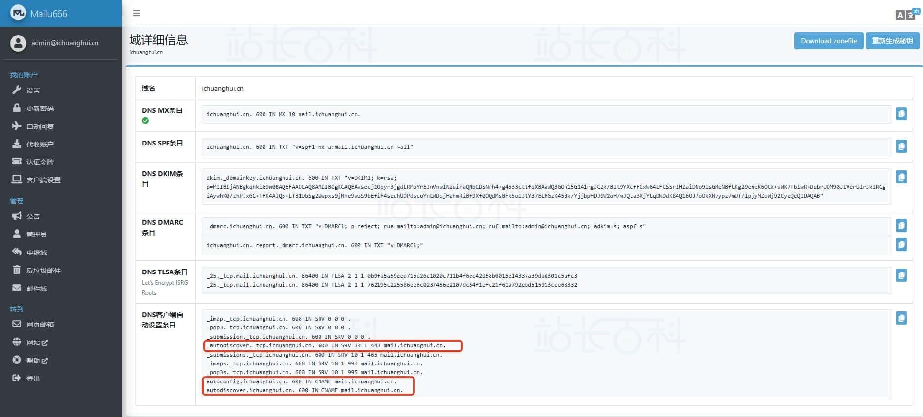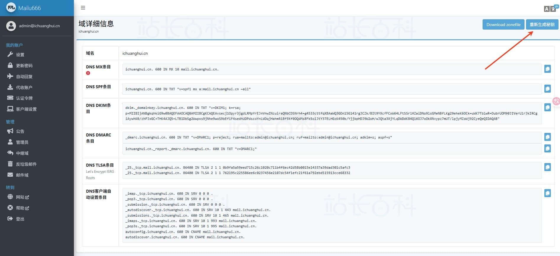 这一步很关键,登录管理员后台,点击“邮件域”>第一个图标,会看到系统生成的记录,点击右上角的“生成密钥”会生成DKIM和DMARC条目。按照以下步骤解析: