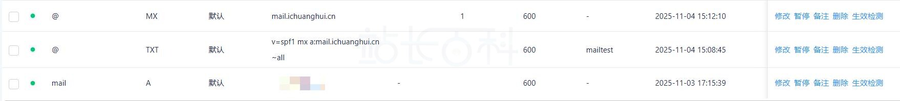 登录域名服务商后台进入域名解析页面,添加A、MX、TXT域名解析,由于大家的域名商不同后台也有差异,这里就不一一列举。