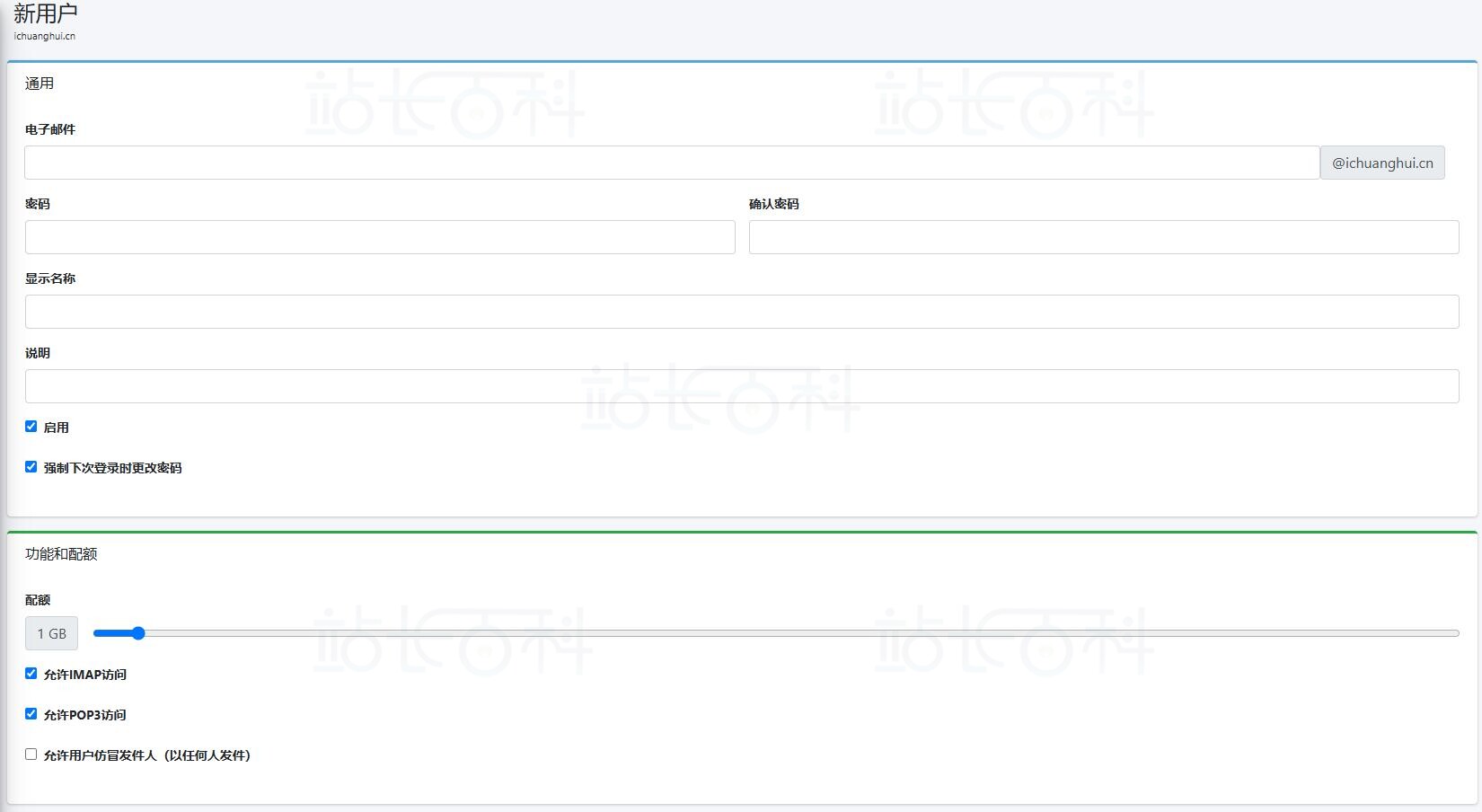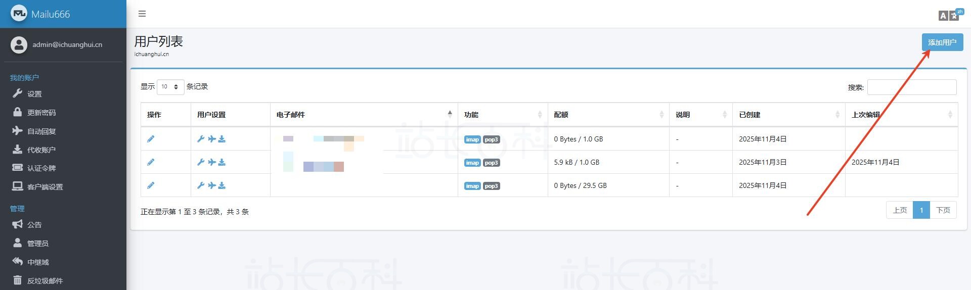 点击右上角“添加用户”,输入邮箱前缀、密码,选择域名,点击保存。