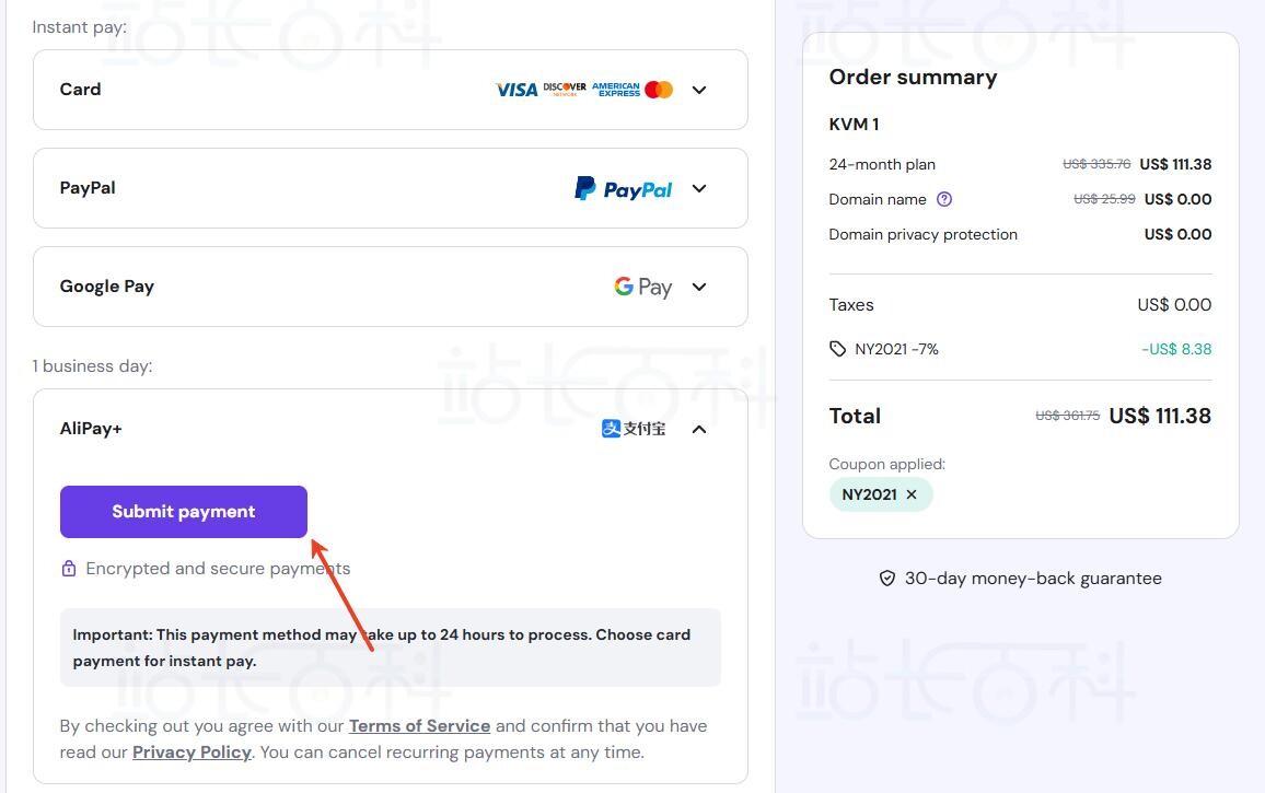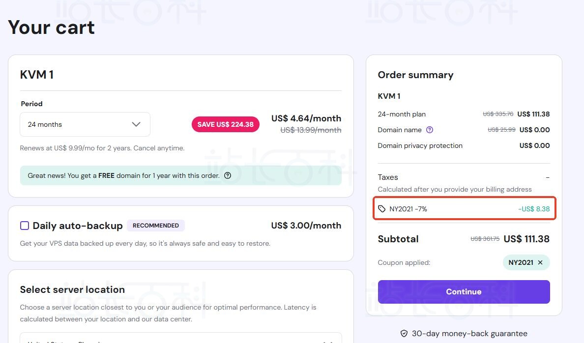 选择付款周期、输入优惠码,机房位置先不管。目前选择24个月付款周期是最划算的,使用我们独家优惠码“ny2021”支持在其官网任何优惠的基础上叠加折扣。如下图: