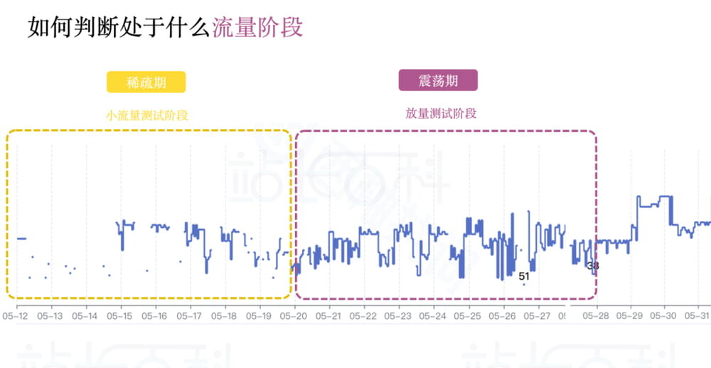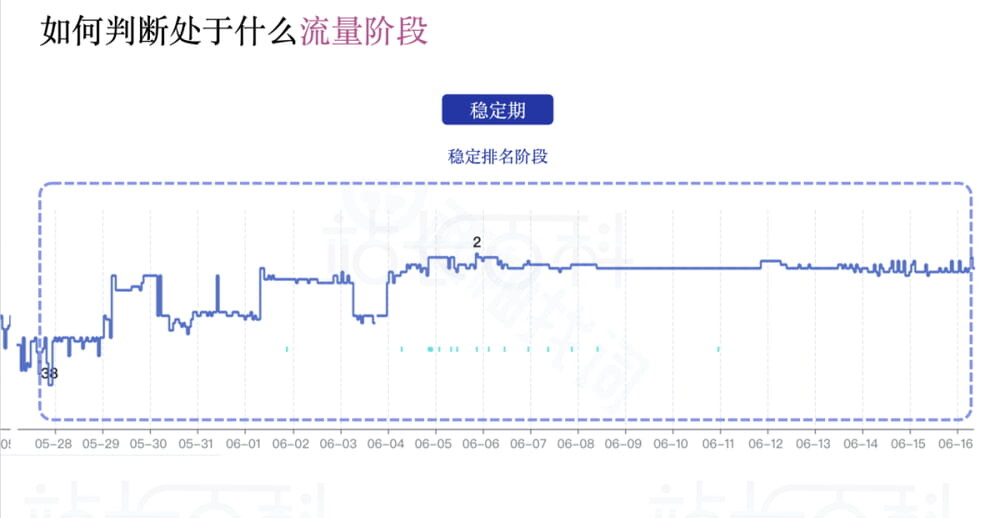 如果在震荡期表现优秀,则会获得一个靠前的稳定排名。如果在这个阶段表现不尽如人意,那么流量又会回收,持续在震荡期徘徊,或者掉入稀疏期。