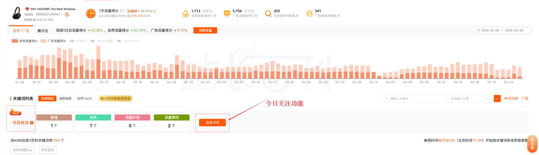 为了帮助我们更加精准地捕捉到产品的流量机会以及潜在流失风险,及时调整策略,更加有效地把握住窗口期。西柚找词的“今日关注”功能提供了4个维度数据,自然排名“新增”、“流失”、“流量升档”、“流量降档”。接来来为大家一一介绍。