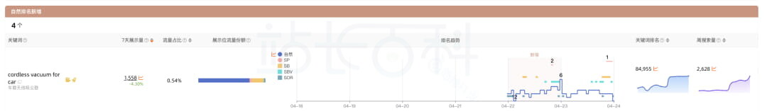 新增是指昨日ASIN在关键词搜索结果页前3页无自然排名,但今日出现自然排名的关键词。