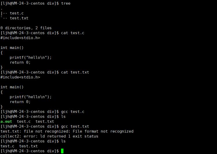 在Linux系统下,文件名后缀没有直接意义,当然,不代表不用,有可能Linux下的别的软件需要用到文件名后缀,就比如gcc这个编译器:
