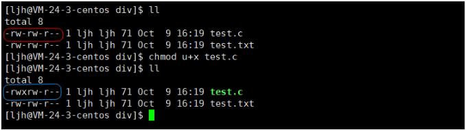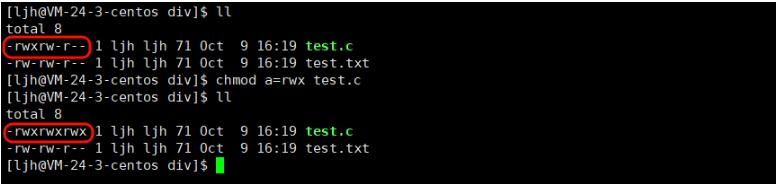 执行chmod a=rwx test.c:将 c 文件的所有者、所属组、其他用户权限都设为可读、可写、可执行。