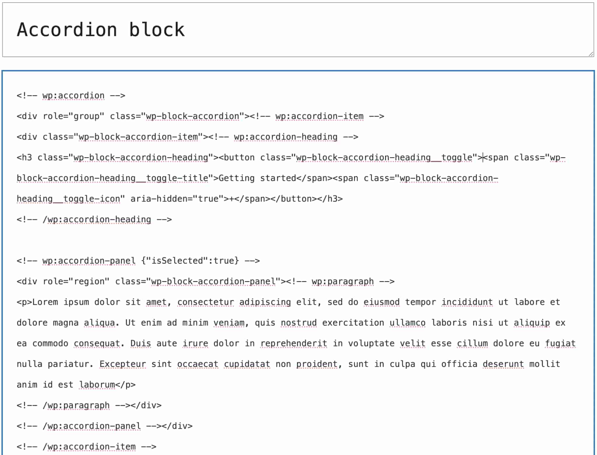 - 手风琴面板:此面板包含手风琴组件的内容,并且可以包含任何类型的区块。