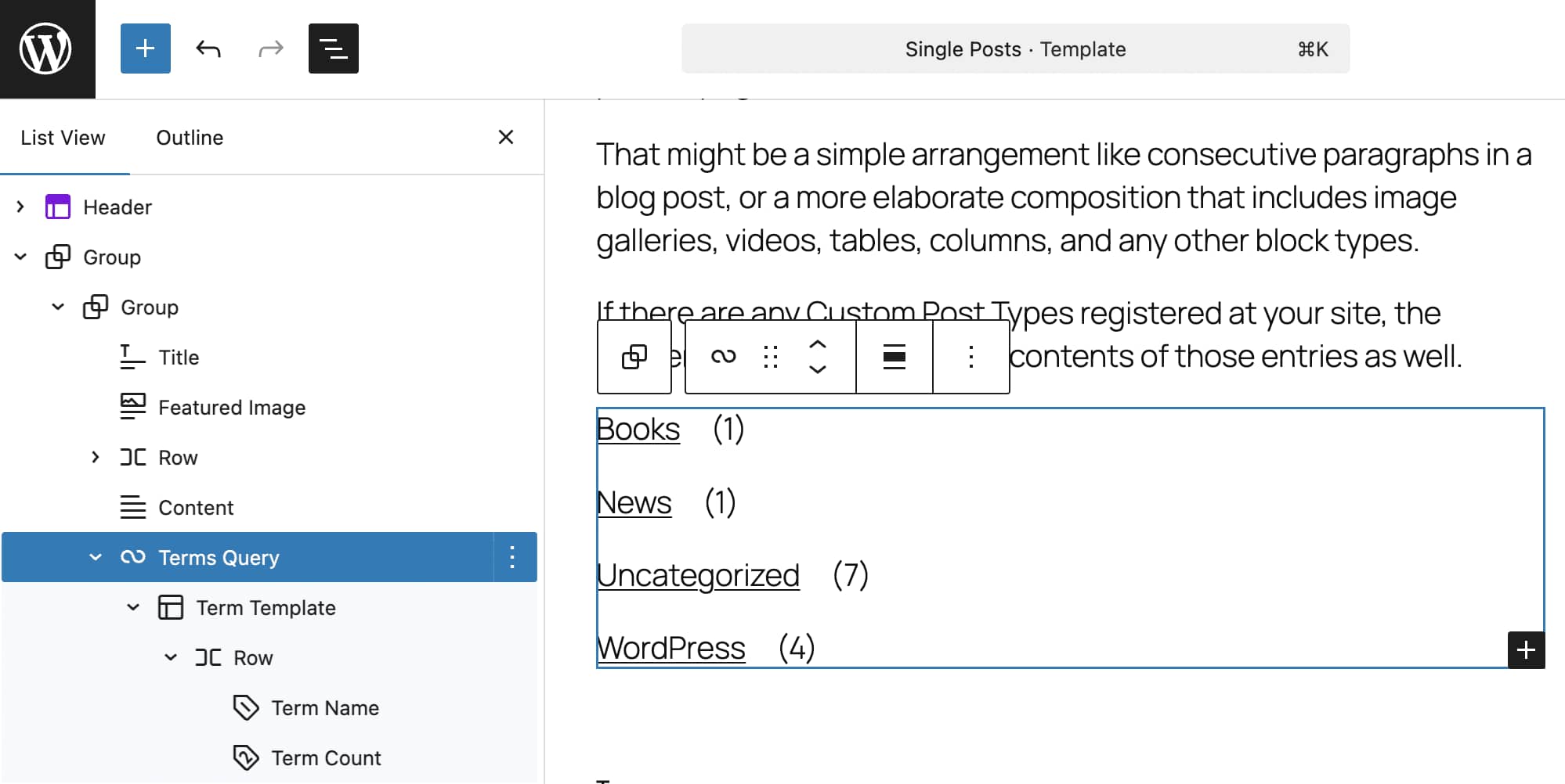 WordPress 6.9引入了一个新的术语查询区块。与查询区块类似,它显示术语而不是文章。这个新区块实际上是一个术语模板,其中包含一个带有术语名称和术语计数的行区块。
