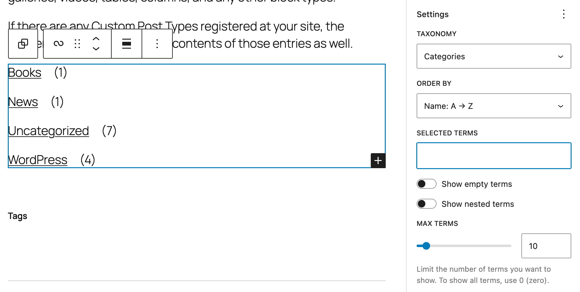 术语查询块提供多种配置选项。可以设置分类法、对列表项进行排序、指定选定项,以及选择显示或隐藏空术语或嵌套术语。还可以设置要显示的术语数量。