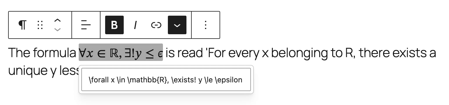 “数学公式”模块允许在内容中插入数学公式。只需使用 LaTeX 语法编写公式,它们就会被转换为相应的数学符号。