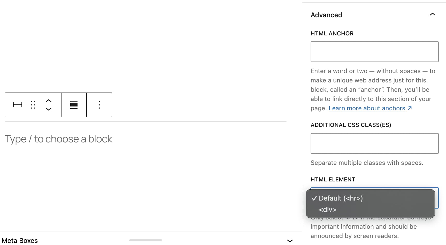 对于分隔符块,可以选择“<hr>”或“<div>”。