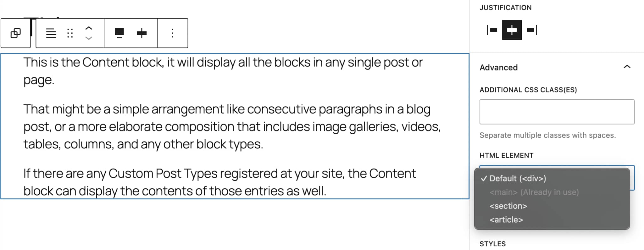 从 WordPress 6.9 开始,可以为文章内容块选择语义合适的包装器。可以选择“<main>”、”<section>”或“<article>”。
