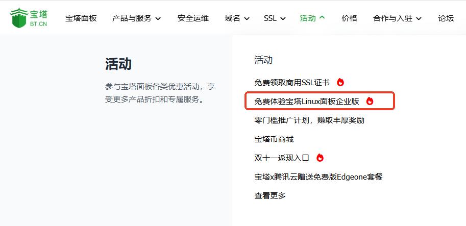 试用地址:宝塔面板官网首页>顶部导航栏下拉“活动”>找到“免费体验宝塔Linux面板企业版”: