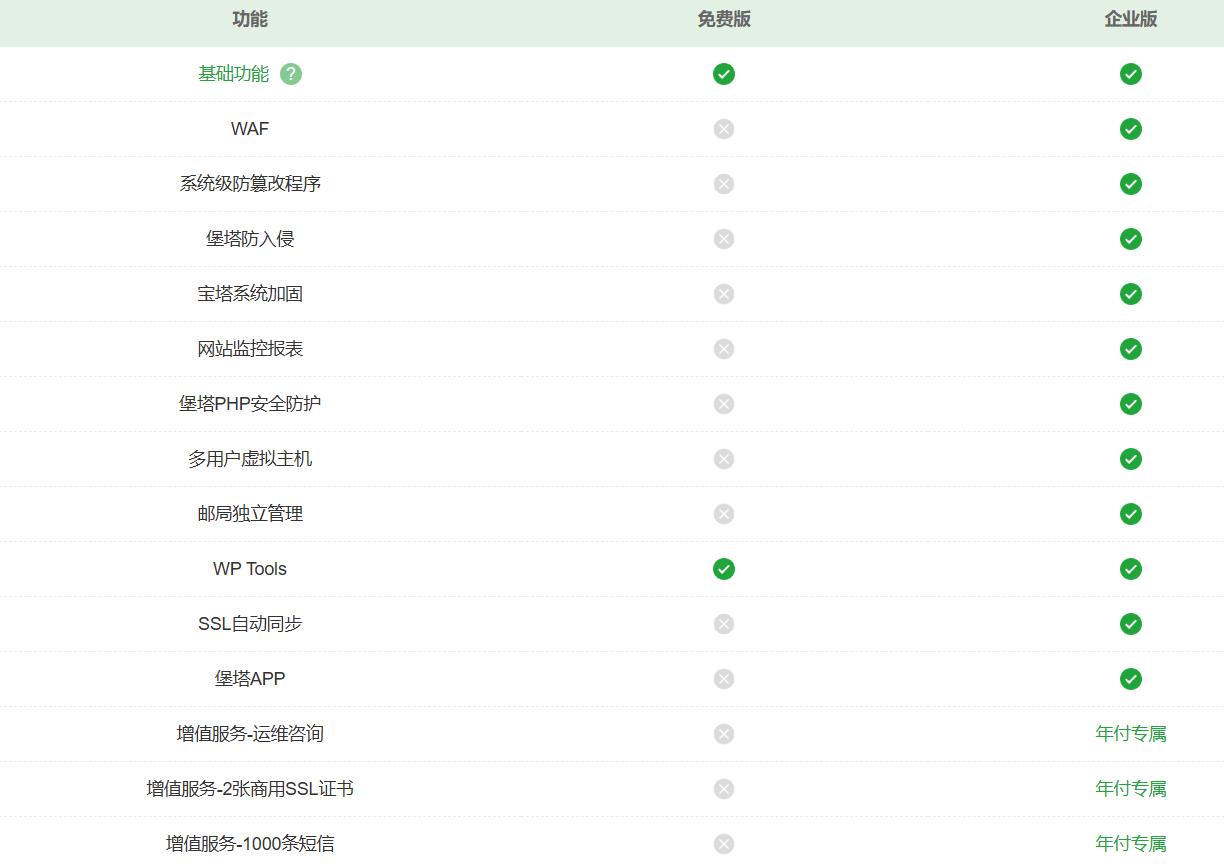 宝塔Linux面板企业版为付费版本,包含免费版、专业版所有功能,包含PHP网站安全告警、堡塔防入侵和堡塔企业级防篡改等27款价值27000多元的企业版插件。