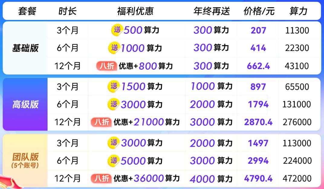 6个月:价格1794元,算力131000,福利送3000算力,年终再送2000算力