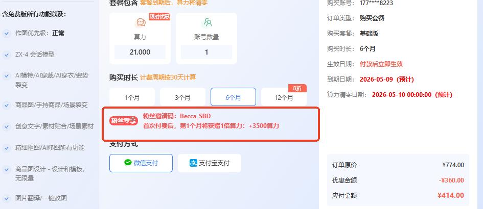 6个月:价格414元,算力22300,福利送1000算力,年终再送300算力