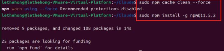 如果执行步骤 6 时出现 npm 版本错误提示(例如要求更新到 11.5.2 版本),可通过以下命令清理 npm 缓存并升级到指定版本: