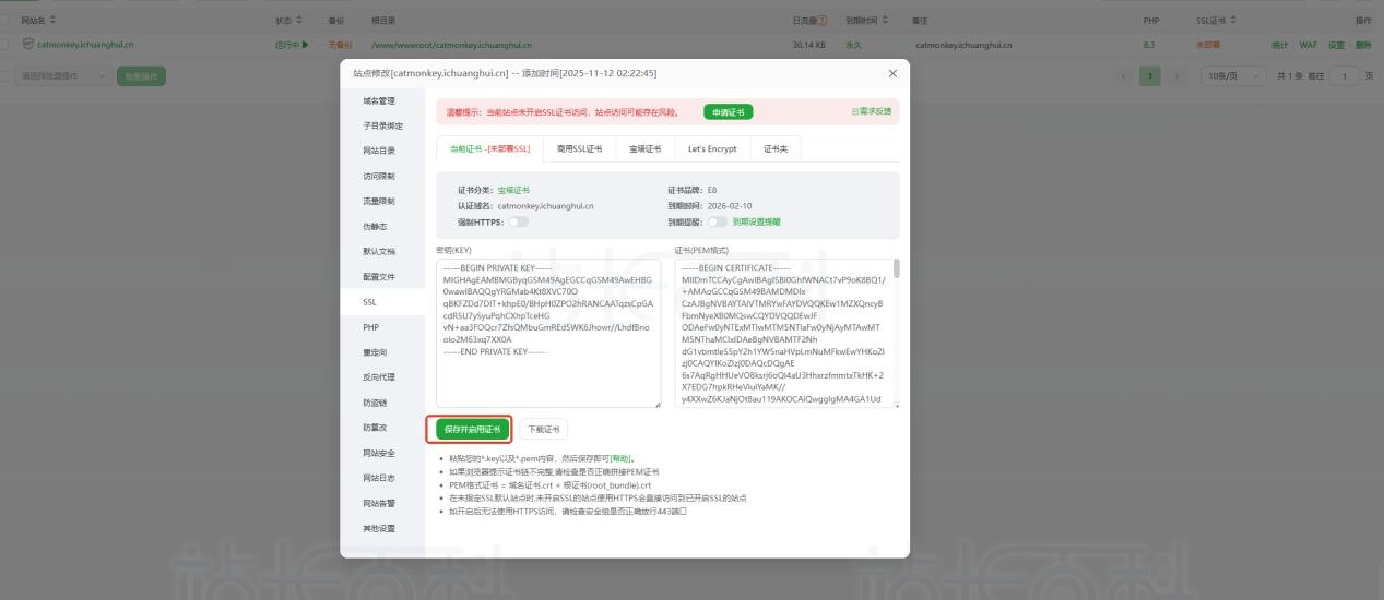 证书成功申请并保存到本地,接下来调用即可,我们之前安装了宝塔面板,那么会发现证书已经自动填充,我们只需要启动即可:
