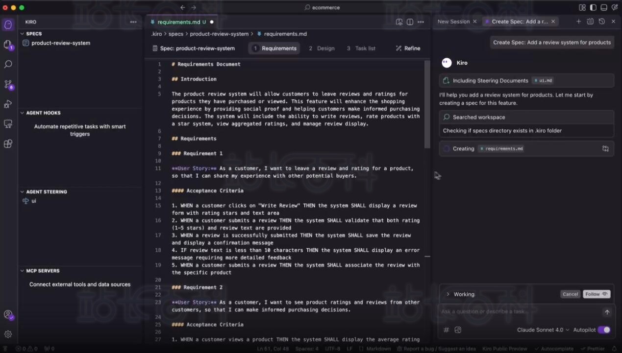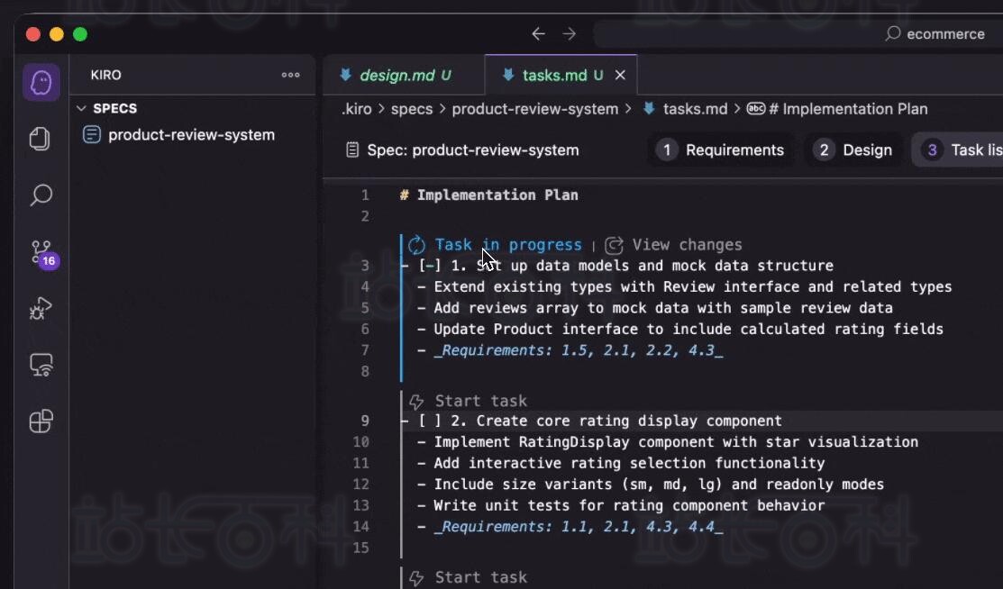 - 需求阶段:Kiro将协助你用EARS标注法梳理规范的需求文档