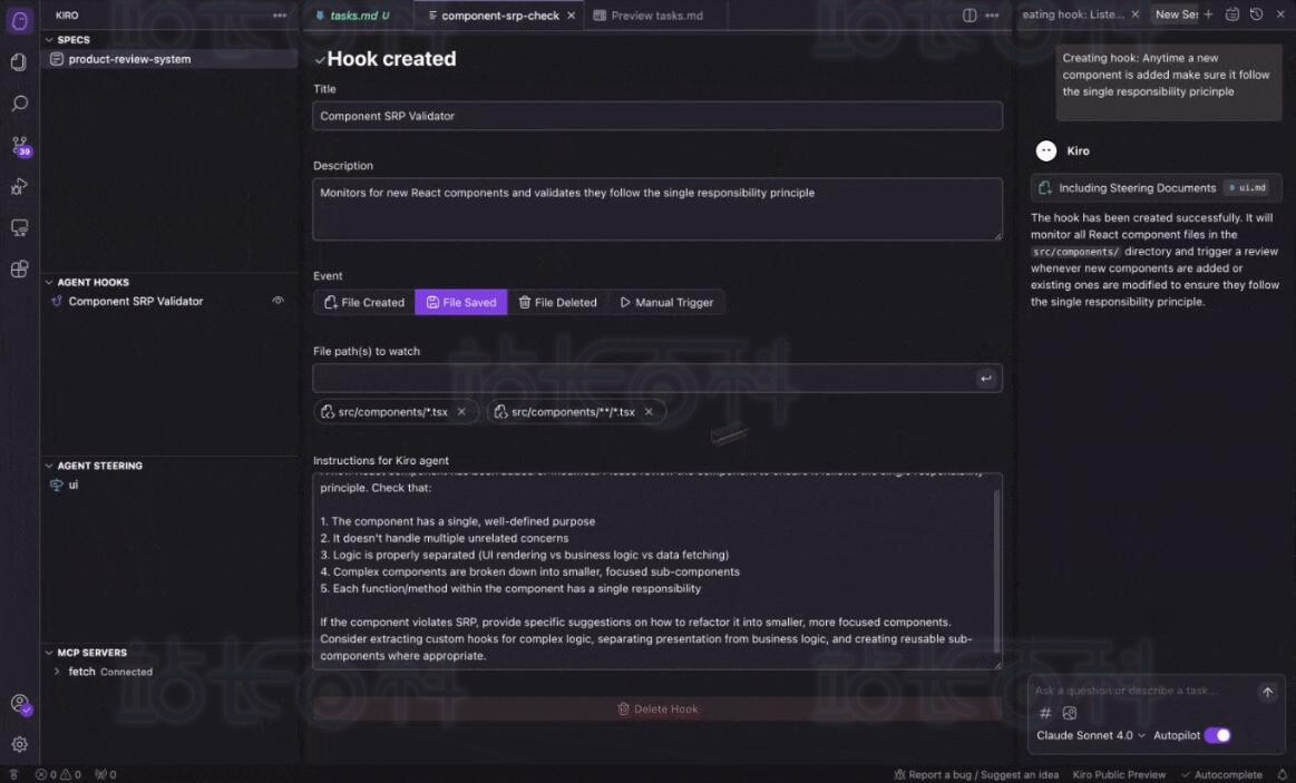 在 Kiro 面板中,找到「智能代理钩子」板块,点击「+」按钮新建钩子
