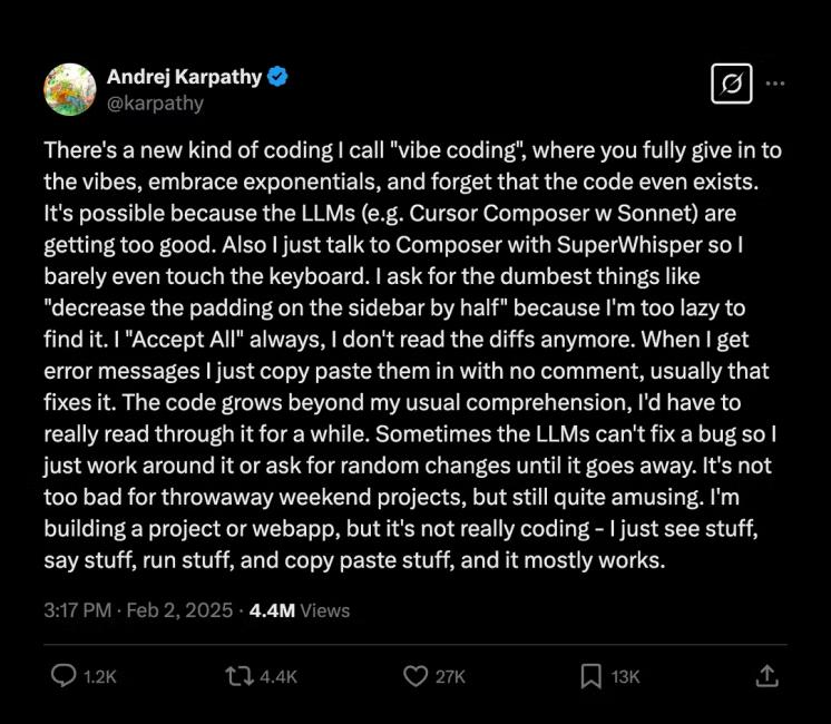Vibe Coding(氛围编程)由计算机科学家、OpenAI联合创始人兼特斯拉前人工智能主管Andrej Karpathy于2025年2月首次推出,短短几个月在全球开发者社区引起了较大反响。