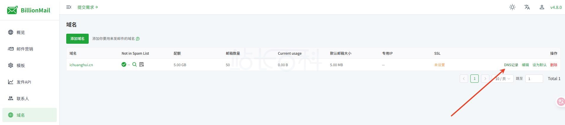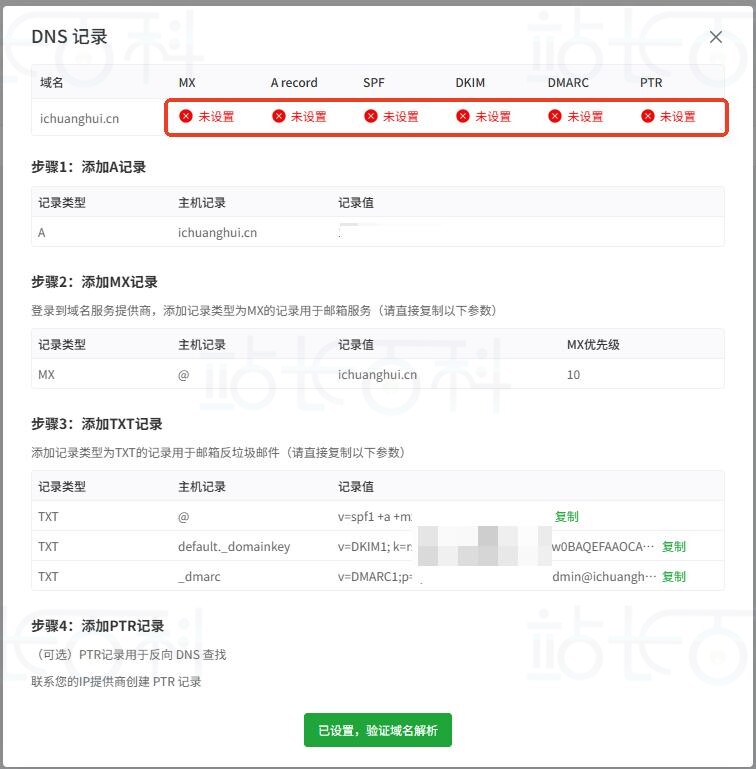 域名添加后在后方位置点击“DNS记录”进行域名解析。如下图所示,目前未进行解析因此状态都是错误的,后续解析成功后会弹出绿色。