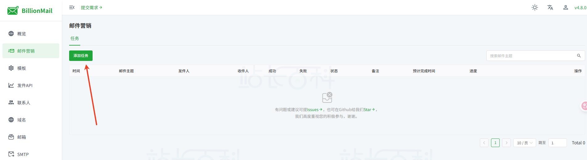 接下来可以直接转到“邮件营销”模块点击“添加任务”,即开始编辑邮箱发送。此步骤设计发件人、联系人和发件模板,大家可以在对应板块先添加完成之后在进行此步骤,或者也可以根据本教程一样在添加任务的同时新建这些信息。