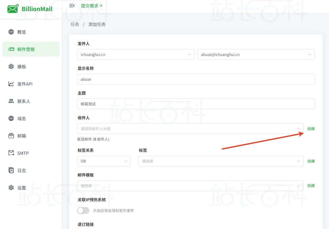 首先下来选择发件人信息依次创建发件名称、主题、收件人、标签和邮件模板: