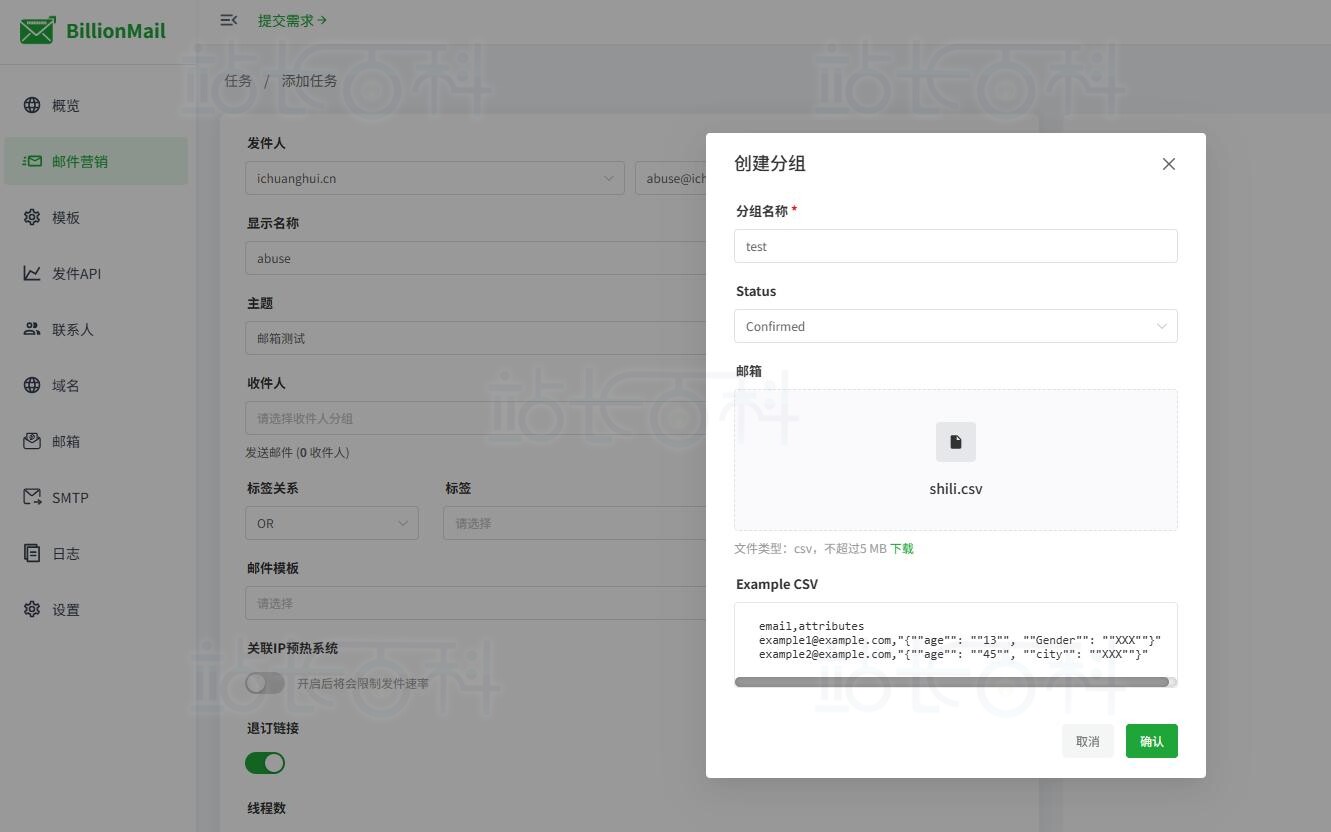 - 收件人:点击“创建”分组,直接按照图片中的示例新建一个csv格式的文件并上传,注意格式正确。