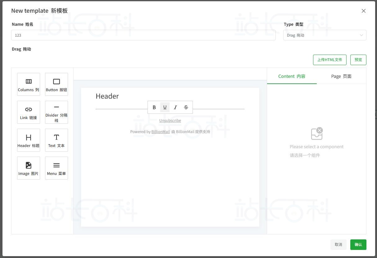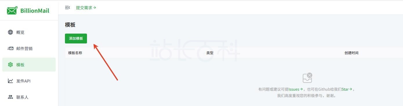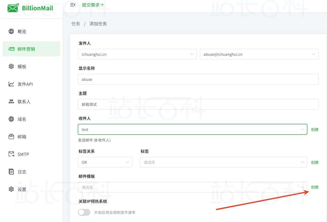 - 邮件模板:选择邮件模板, 用于此次邮件营销任务。点击后方“创建”>”添加模板”;