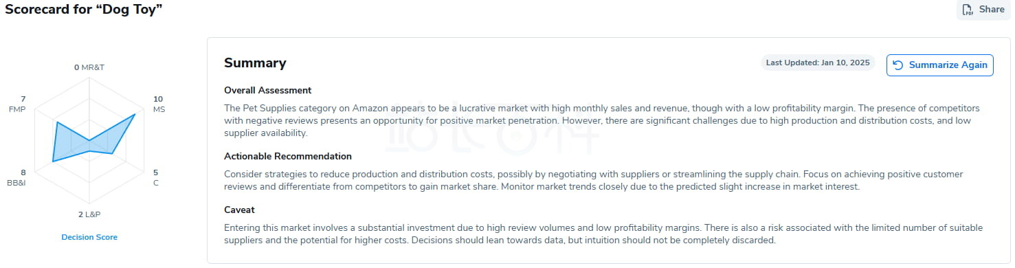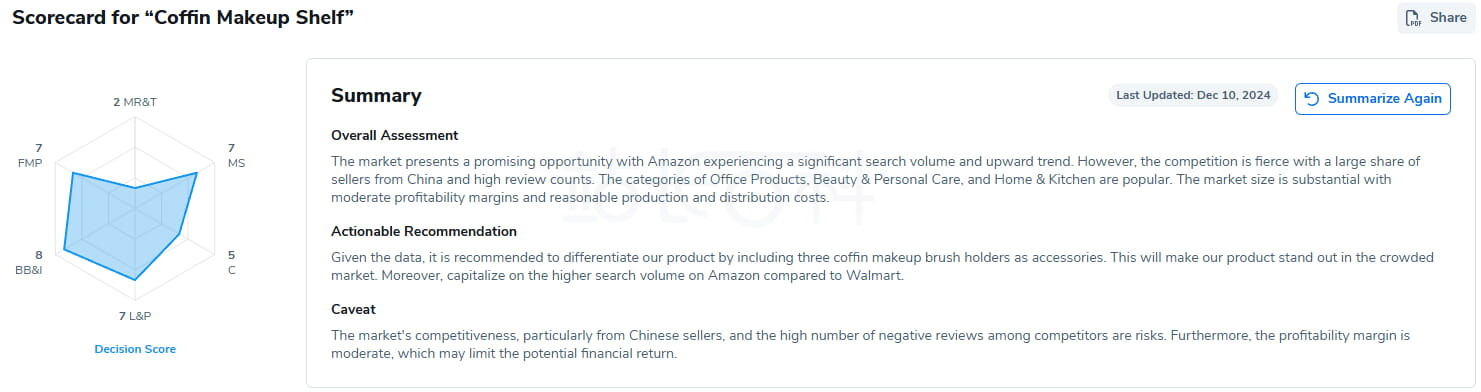 最后查看决策评分和总结,以帮助您决定您的产品创意是否值得继续推进。