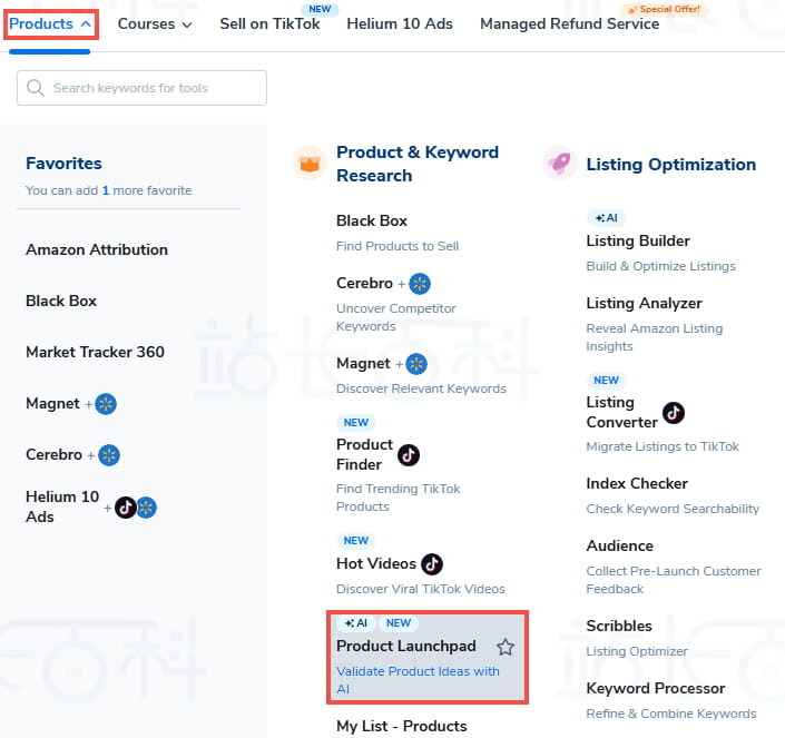 Product Launchpad位于“Product”菜单下的“Product & Keyword Research”部分。