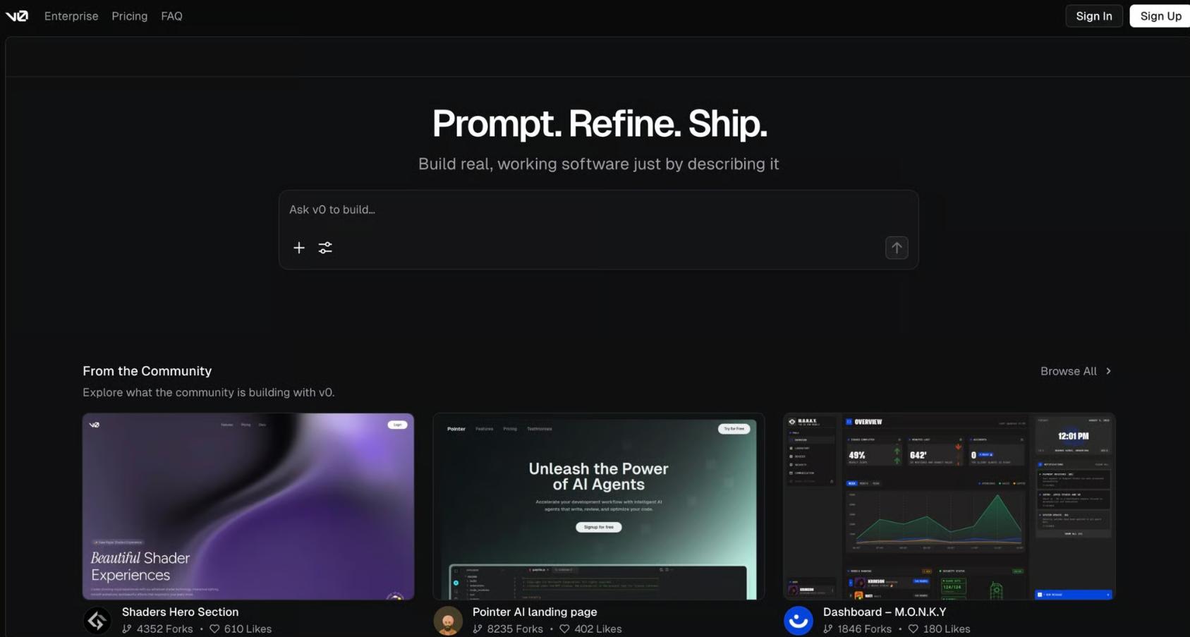 Vercel的v0专注于创建用户界面元素,而非完整的网站。可以将其视为一个构建单个组件(例如登录表单、导航栏或价格表)的工具,然后可以将这些组件复制到实际网站项目中。