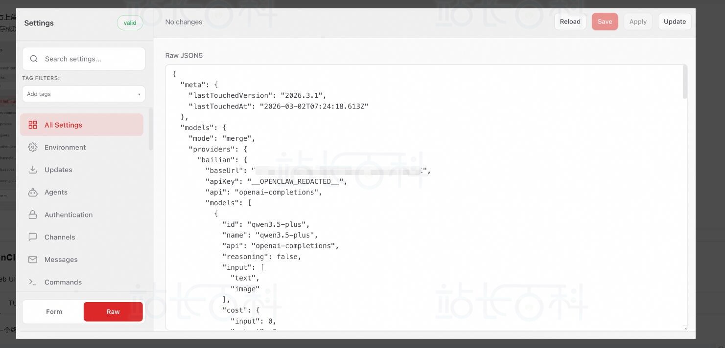 保存成功后,apiKey将显示为“__OPENCLAW_REDACTED__”。脱敏保护,仅用于前端界面隐藏,不影响实际调用。