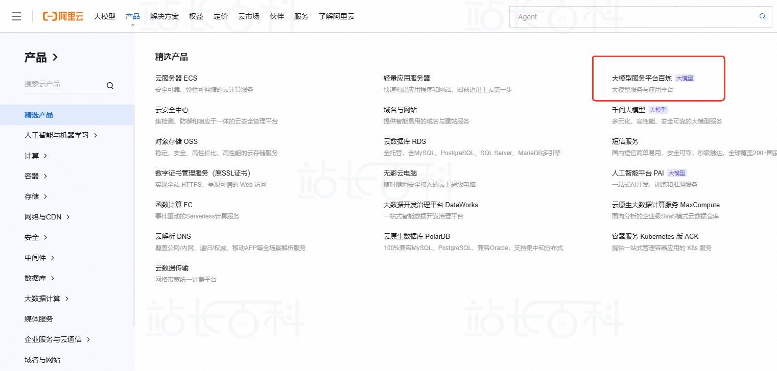 访问阿里云官网,顶部导航栏产品部分找到“大模型服务器平台百炼”。