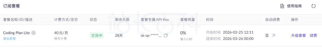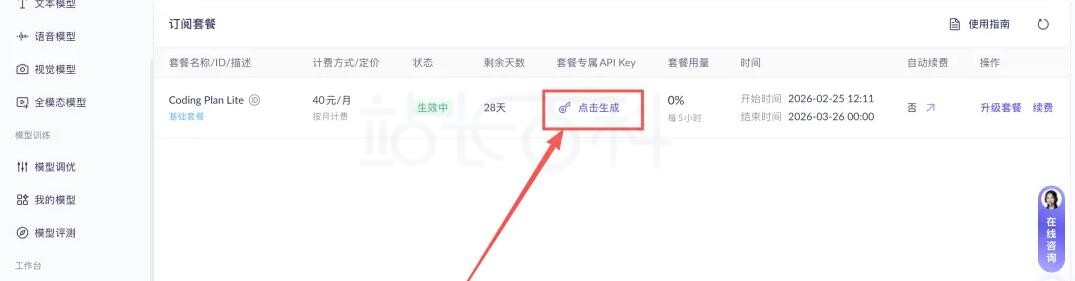支付完成后在Coding Plan页面找到API Key(一般格式为sk-sp-xxxxx,和百炼通用的sk-xxxxx略有区别)