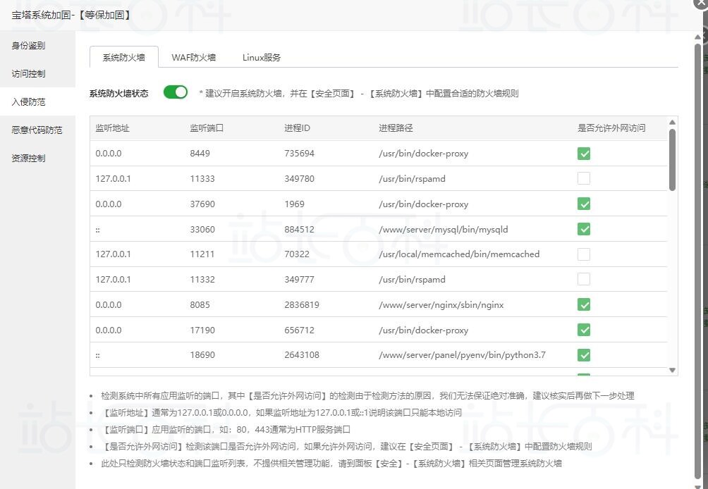 开启该功能可以从操作系统防火墙(Firewalld/Iptables/UFW等)查看监听的地址、监听端口、进程ID、进程路径、是否运行外网访问等参数查看程序使用情况;Linux服务的服务名、服务状态等。