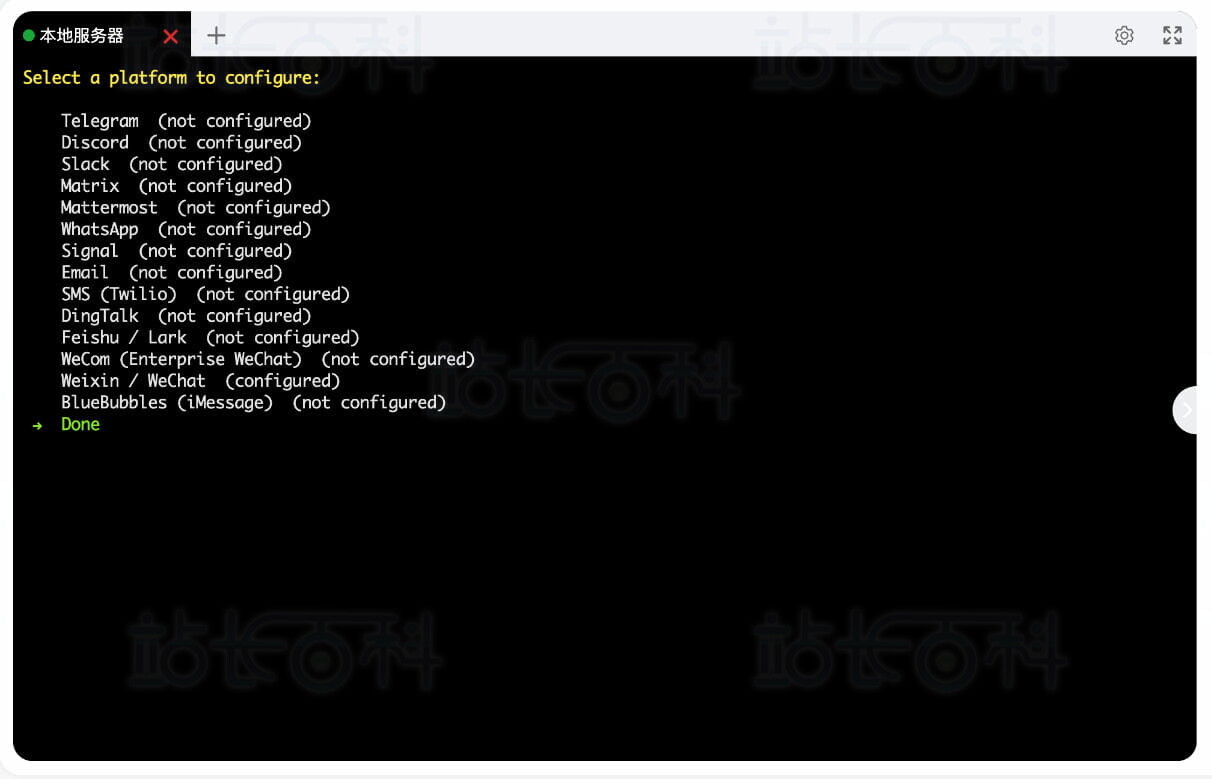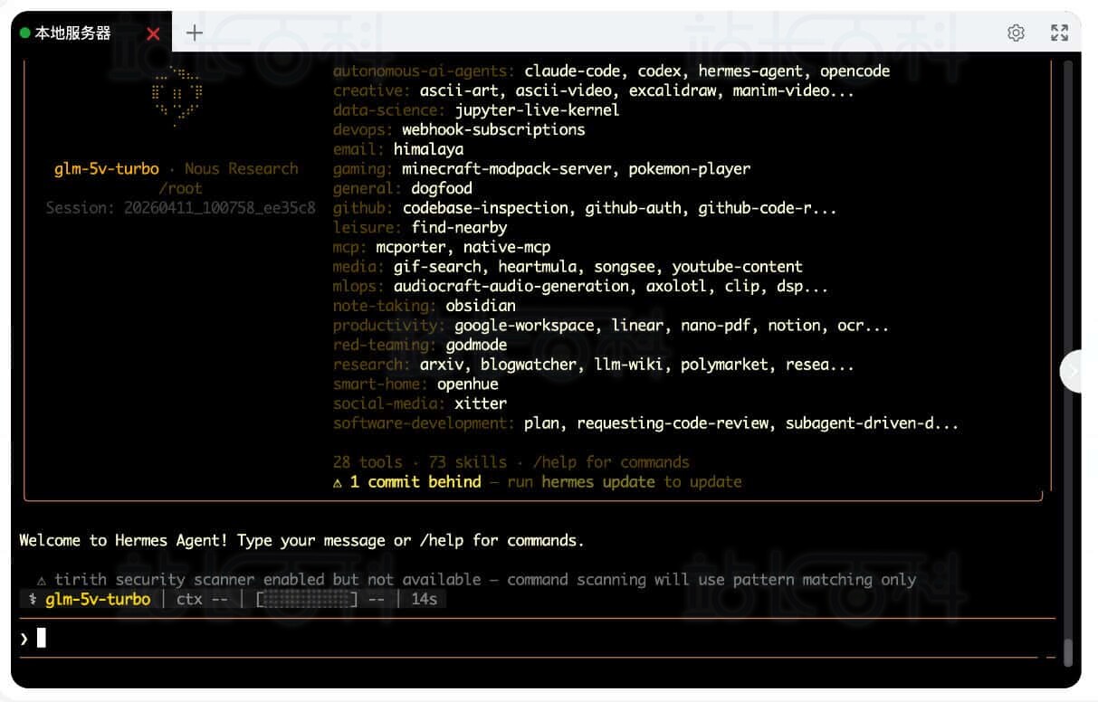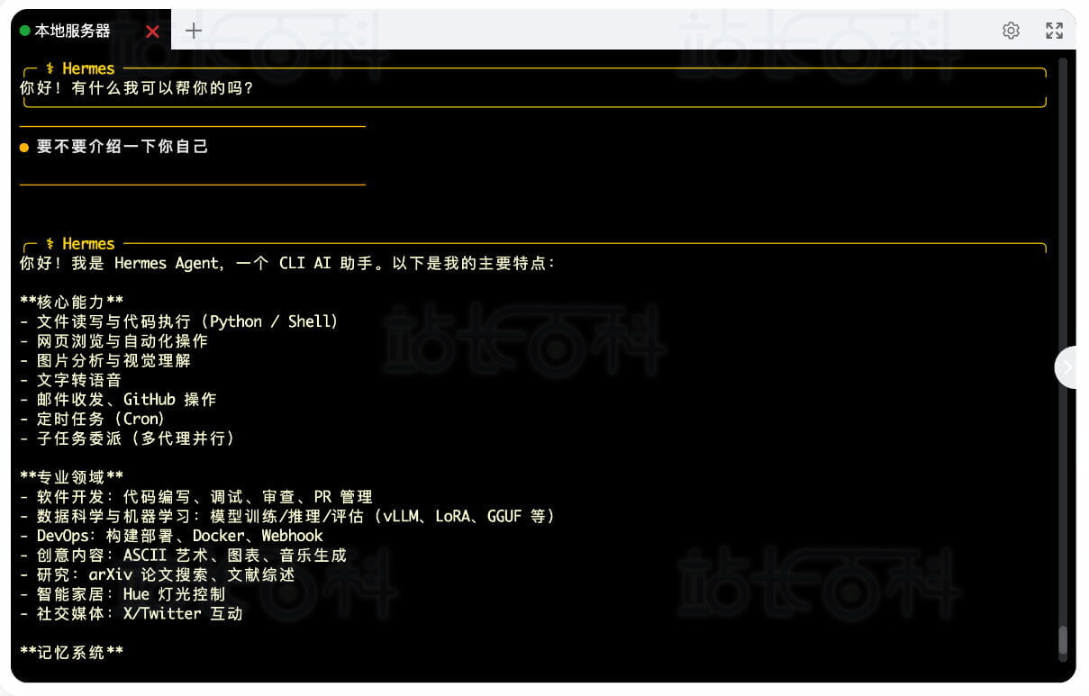 注意:Hermes Agent没有自带Web管理页面,只能在终端或消息通道里对话。