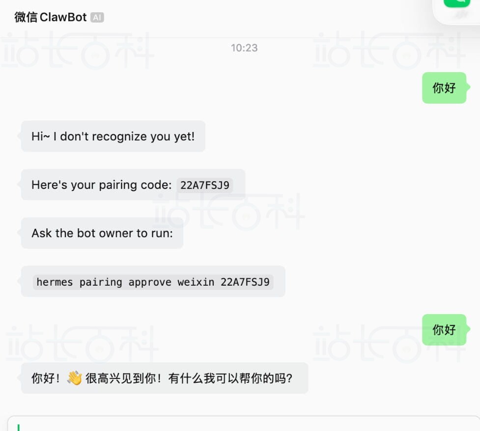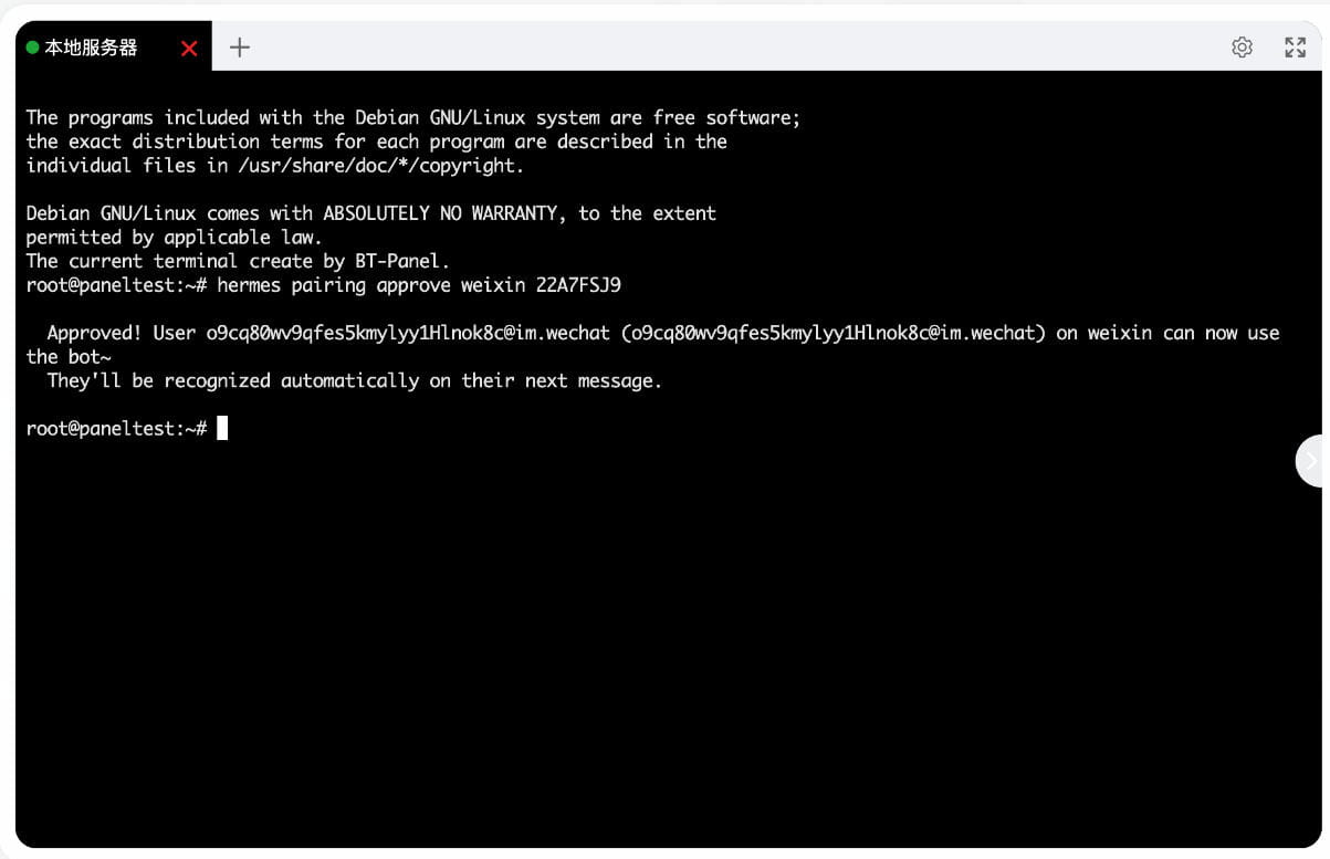 10、在微信里给Hermes发送任意消息,会返回一条命令,复制到终端执行。