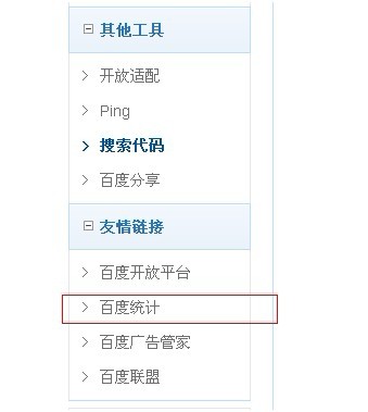 第一步:在百度站长平台工具区(http://zhanzhang.baidu.com/dashboard/index)中点击左侧友情链接中的“百度统计”按钮。