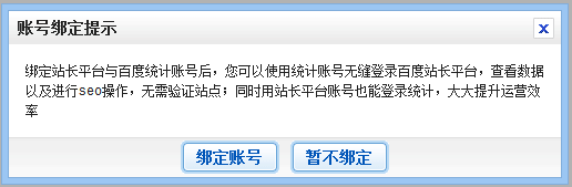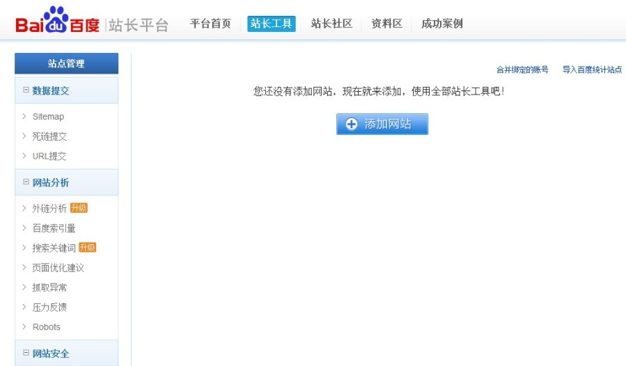 现在已同时有百度站长平台及百度统计的账号,可通过账号绑定将两个账号进行绑定并合并账号下的站点,统一进行管理,大大降低管理多个账号带来的繁琐。