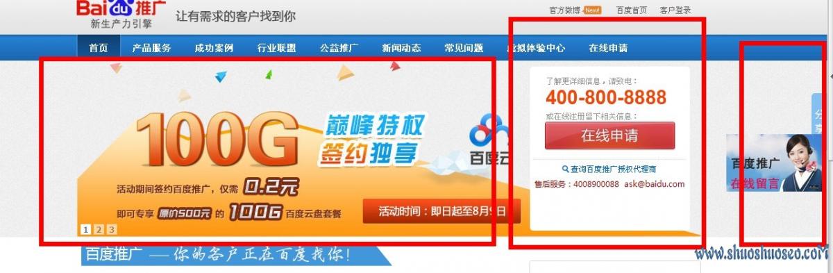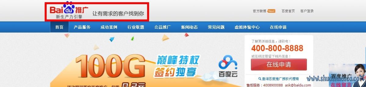 用户进入你的网站一般第一眼都是看到你的网站上半部分。我们看看百度竞价推广的网站头部是让有需求的用户找到你,这个说明了百度竞价的目的就是精准。其次,老板也是非常希望有需求的人能够联系他们,这样真正抓住了老板的心。