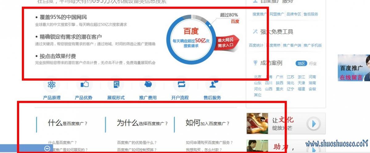 百度的底部放了一下解除用户常见的疑虑。如上图,第一个部分介绍了一下百度竞价的优势,第二个部分详细说明百度竞价。这样做的目的就是逐步地解除用户疑虑,让用户不知不觉地想去做百度推广。