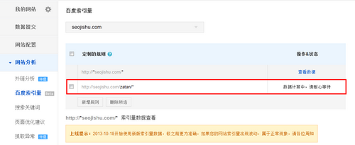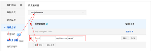 上图是我按照示例3进行的书写,当我们进入百度站长工具->网站分析->百度索引量之后,选择需要查询的网站并点击新增规则就会出现如图中红色边框的图例。